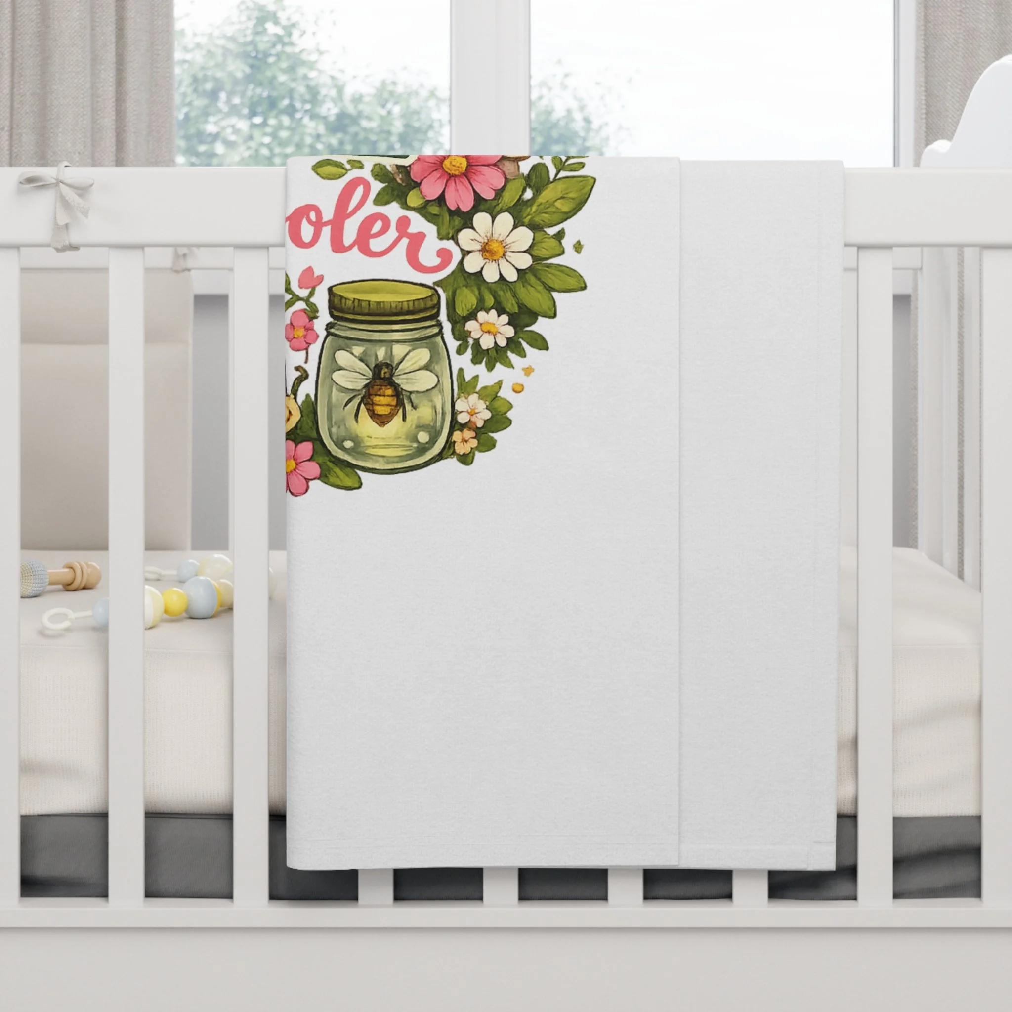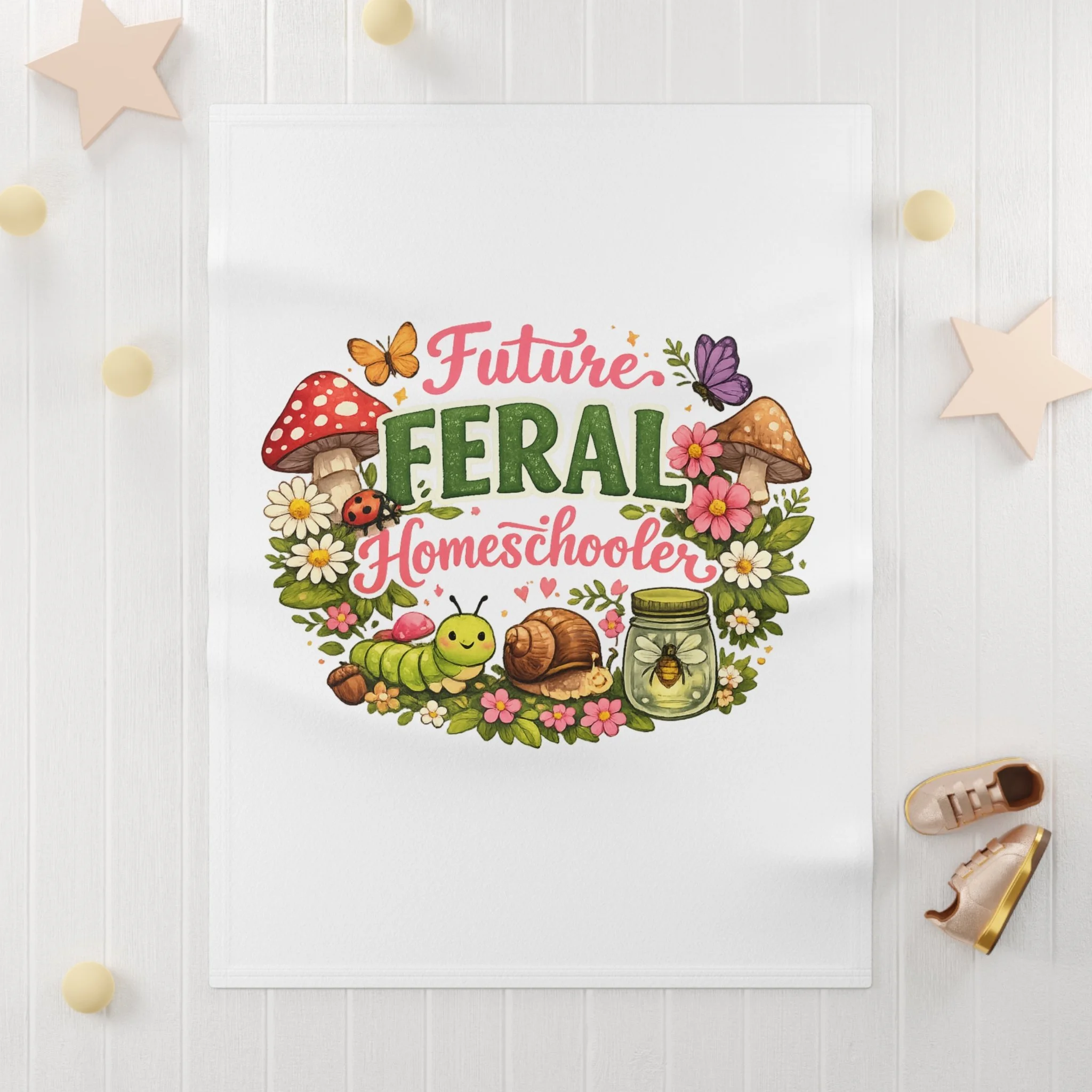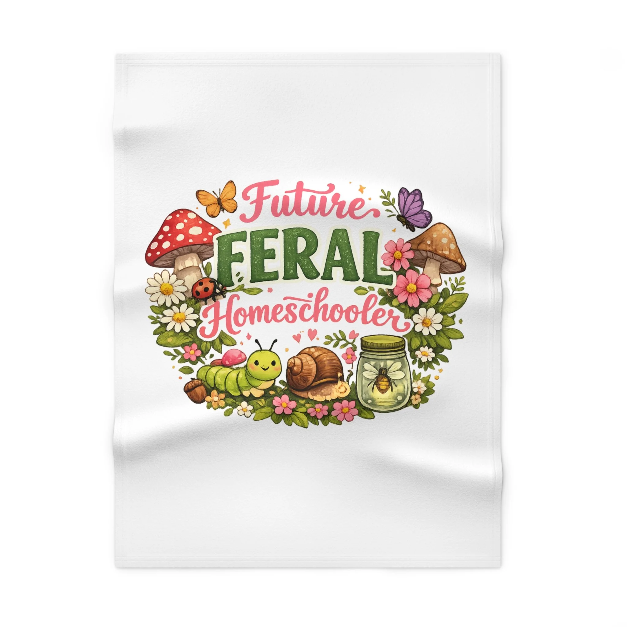Soft, snuggly fleece made for tiny adventurers who love exploring the backyard and soaking up cozy learning moments. This lightweight baby blanket wraps little ones in warmth while showcasing a playful, nature-inspired design—mushrooms, butterflies, snails and a jar of fireflies—framing the cheerful wording. Use it during storytime on the living-room floor, draped over a car seat for a sunny park outing, or as a familiar comfort during nap and quiet learning sessions at home. The one-sided print keeps the artwork bright and clear, while the durable stitching stands up to repeated washes and everyday use. It feels gentle against delicate skin and brings a homespun, whimsical touch to nursery decor.