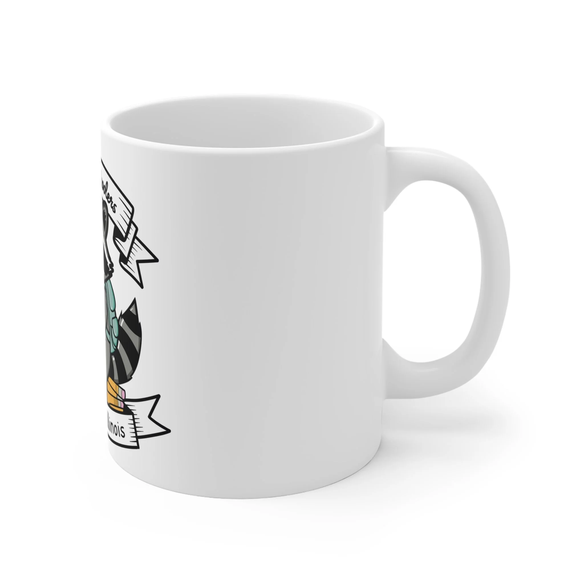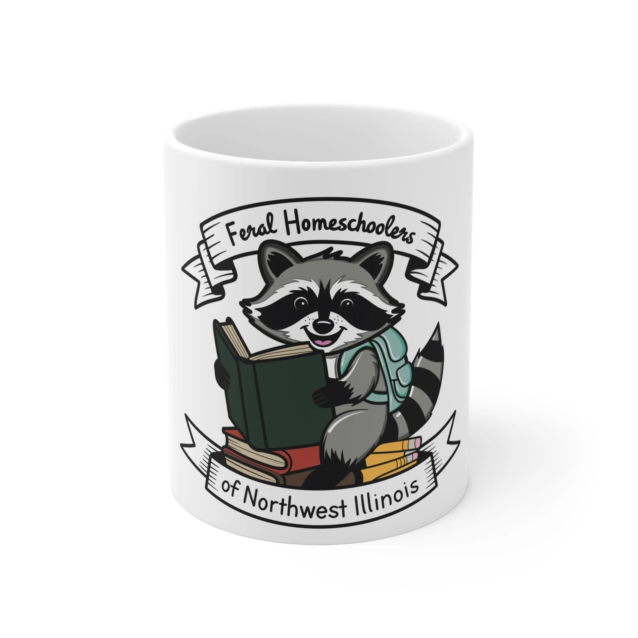 A cozy, smile-starting ceramic mug that celebrates the playful spirit of homeschooling communities. The design shows a cheerful raccoon with a backpack, surrounded by stacked books and a banner that reads “Feral Homeschoolers of Northwest Illinois.” Warm and whimsical, this mug feels like a quiet morning at the kitchen table—hot coffee in hand, lesson plans open, and the little chaos of learning happening all around. It’s made to sit with you through lesson prep, read-alouds, and slow afternoons. The artwork speaks to folks who love low-key adventures, backyard science experiments, and the steady rhythm of homeschooling life in the Midwest.