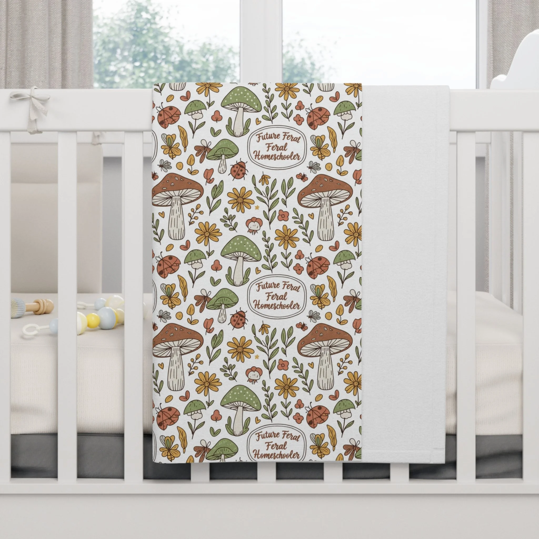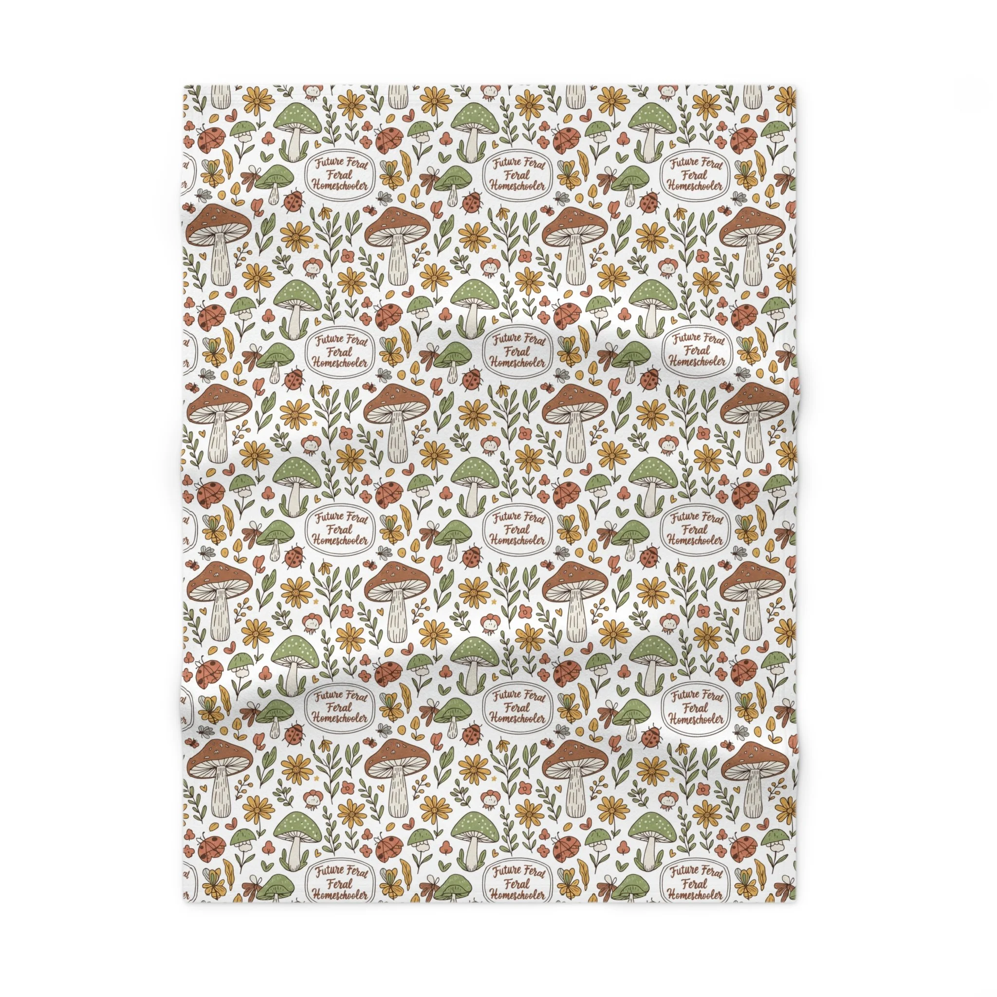 Product features - 100% polyester fleece: soft, durable, quick-drying - One-sided whimsical mushroom and floral print - Size 30″ × 40″ — stroller and crib-friendly - Double-needle topstitching for reinforced edges - Pre-constructed item; printed in the U.S. (made in China)