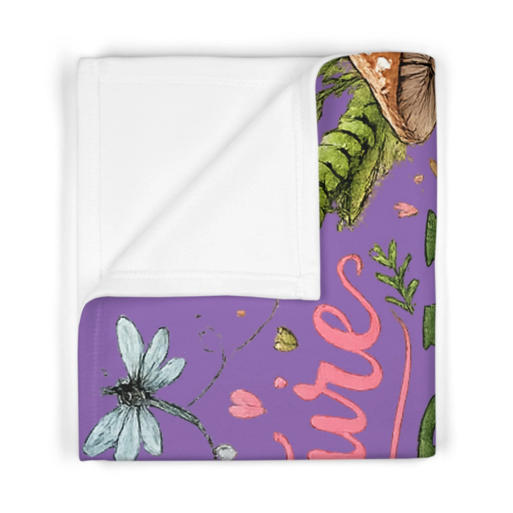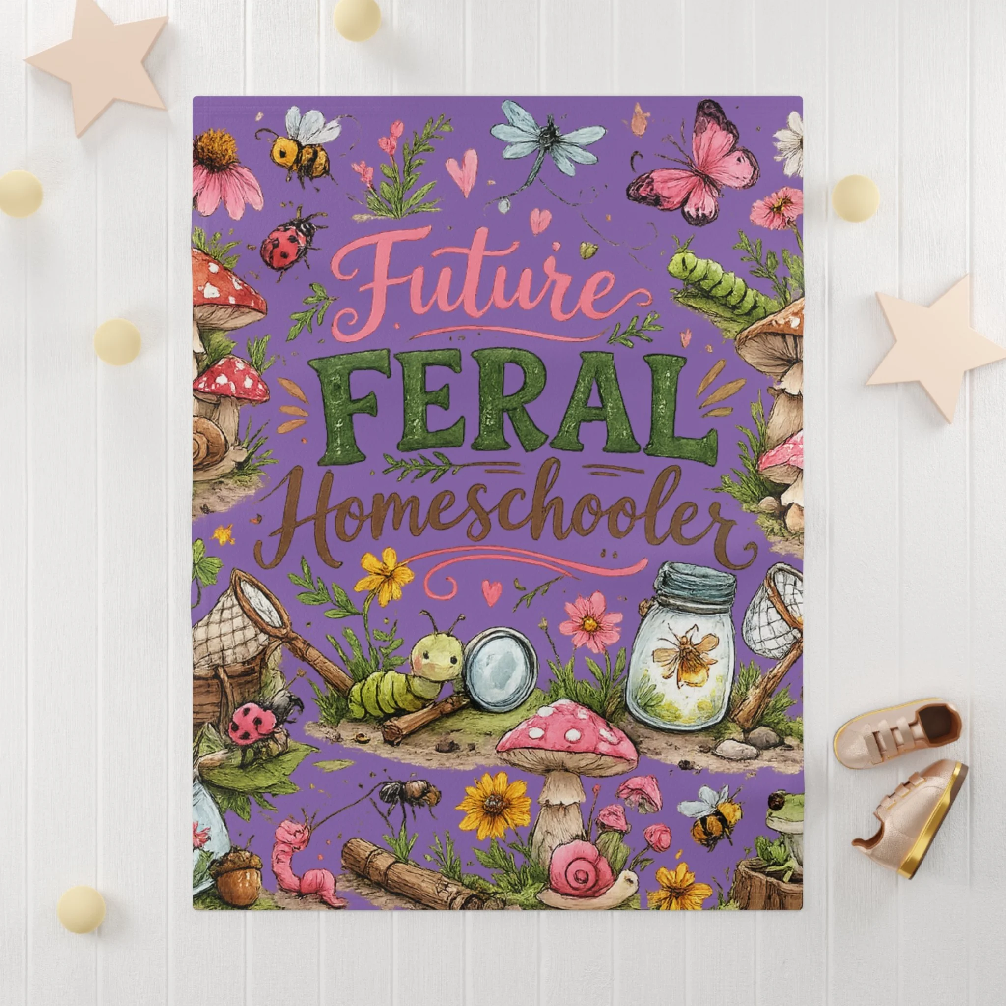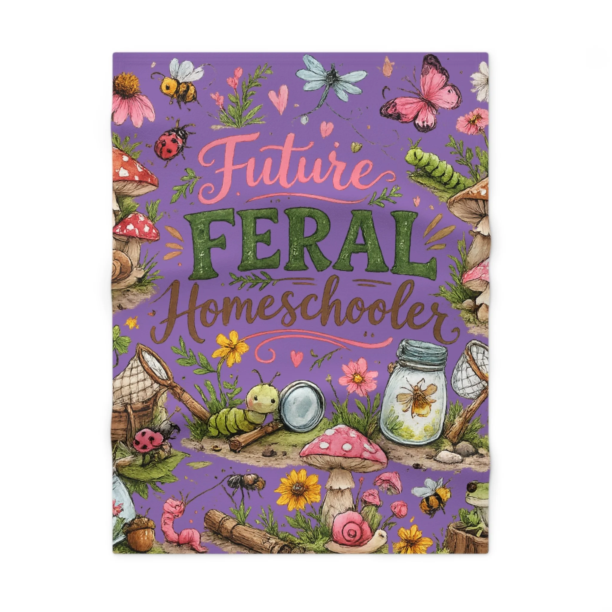 Wrap little ones in whimsical adventure. This soft fleece blanket features a colorful, nature-inspired illustration — mushrooms, jars, bugs, and hand-lettered script reading “Future Feral Homeschooler” — set against a vibrant purple background. Lightweight yet cozy, it tucks easily into a stroller, reading nook, or school-at-home corner and brings a playful, outdoorsy spark to everyday moments. The one-sided print keeps the artwork bright and detailed while the reverse stays plush and gentle against delicate skin. Thoughtful stitching and durable polyester hold up to frequent washes and rough-and-tumble use, so the blanket keeps looking cheerful through many storytimes, outdoor picnics, and nap routines.