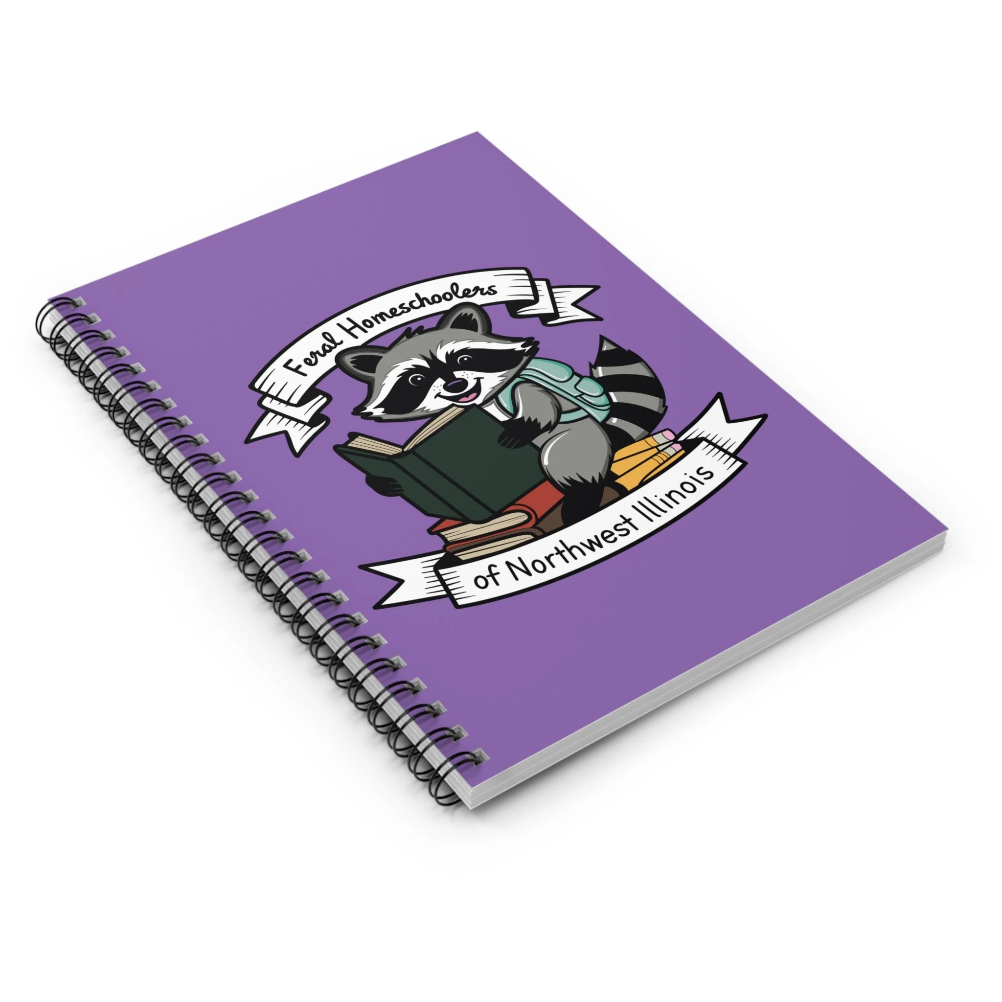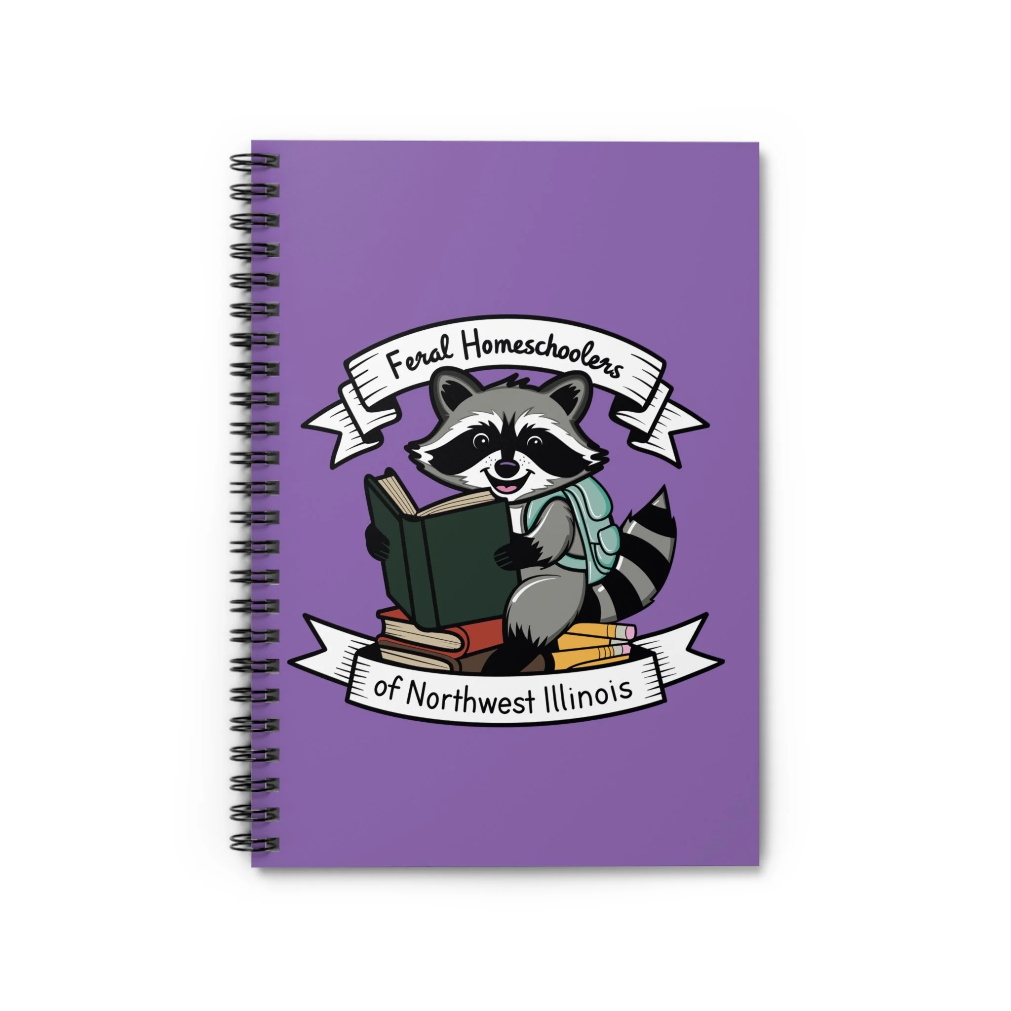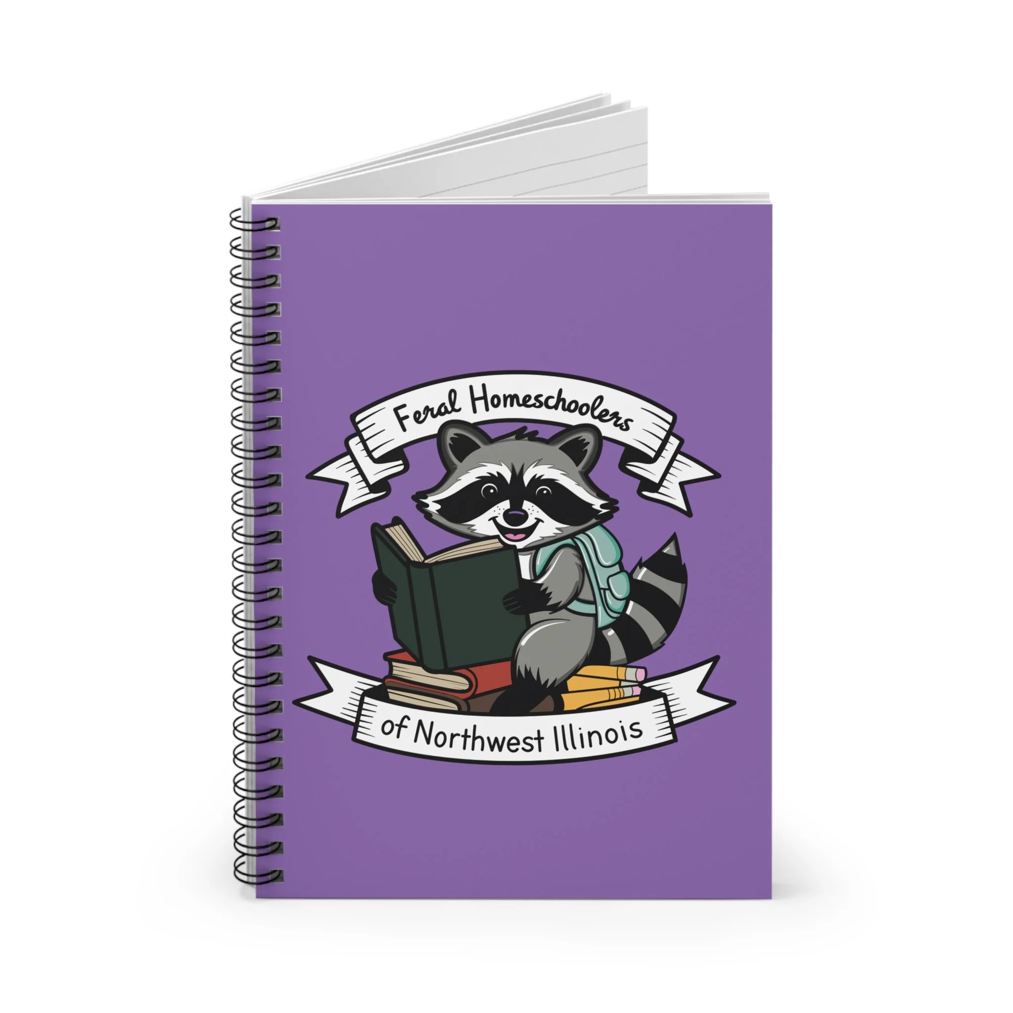 A cheerful, purple-hooded spiral notebook made for bookish kids and homeschool families. The cover features a friendly raccoon character reading on a stack of books beneath a banner that reads “Feral Homeschoolers of Northwest Illinois,” bringing a sense of playful community and curiosity to everyday notes. Inside, 118 ruled pages on smooth 90gsm paper welcome lesson plans, reading logs, sketches, and quick reminders. The sturdy 350gsm covers protect your work while a metal spiral lets pages lie flat or turn easily. A document pocket inside the back cover keeps permission slips, handouts, and small treasures tucked safely away. Compact and portable at 6