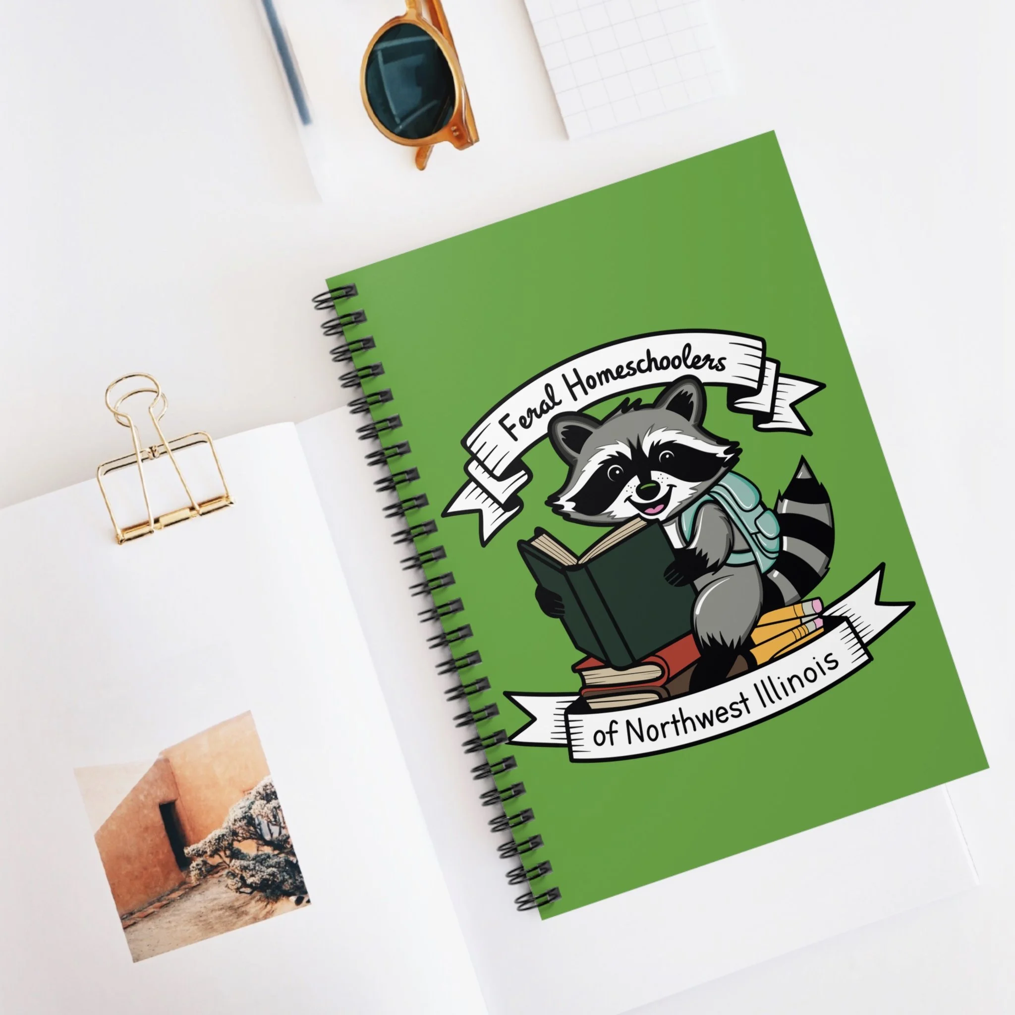 This spiral notebook brings a little joy to everyday learning and note-taking. A friendly raccoon—backpack slung, book open—sits atop a stack of textbooks on a bright green cover, with a hand-lettered banner that reads “Feral Homeschoolers of Northwest Illinois.” The ruled pages invite careful handwriting, lesson plans, and quick sketches, while the sturdy 350 gsm covers and metal spiral keep everything tidy through backpacks and kitchen-table lessons. An inside document pocket holds stray worksheets or permission slips until they’re needed. Compact and light at 6" x 8", it slips into tote bags and cubby holes so it’s always within reach when inspiration or a teachable moment strikes.
