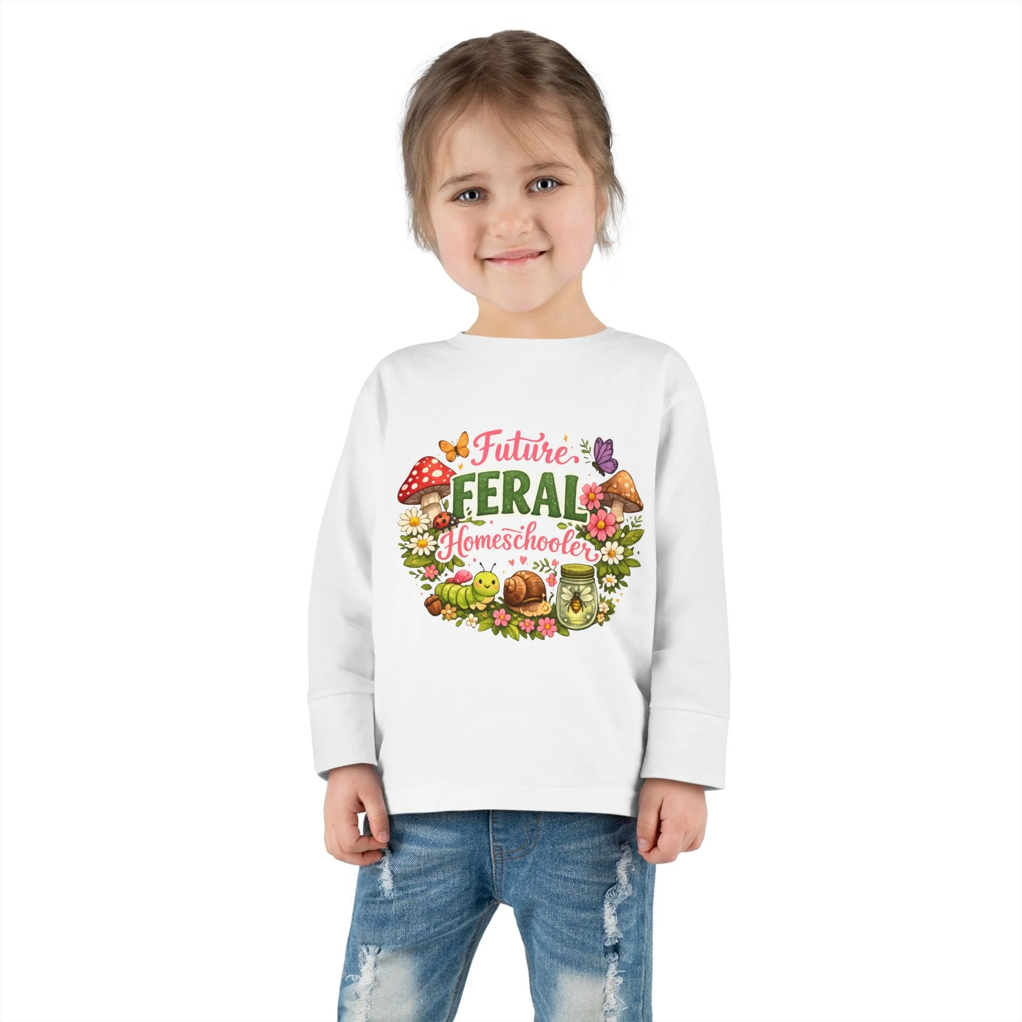 Toddler Long Sleeve Tee — "Future Feral Homeschooler" Nature Graphic